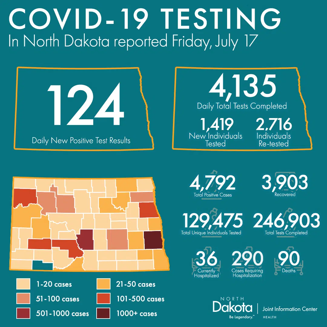 BISMARCK, ND (KFGO) – The North Dakota Department of Health reports 124 positive COVID-19 tests of the 4,135 new total tests conducted.