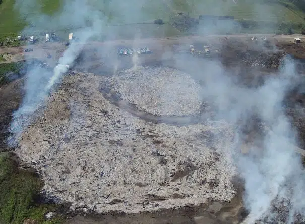 He says the burning wood, wood chips, and grass-covered over 3.5 acres, in piles 25 feet high that had been stored for several years, and was difficult to dispose of. While not yet confirmed, Moore says it’s believed the wood chip pile “spontaneously” started on fire and ignited the main woodpile.
