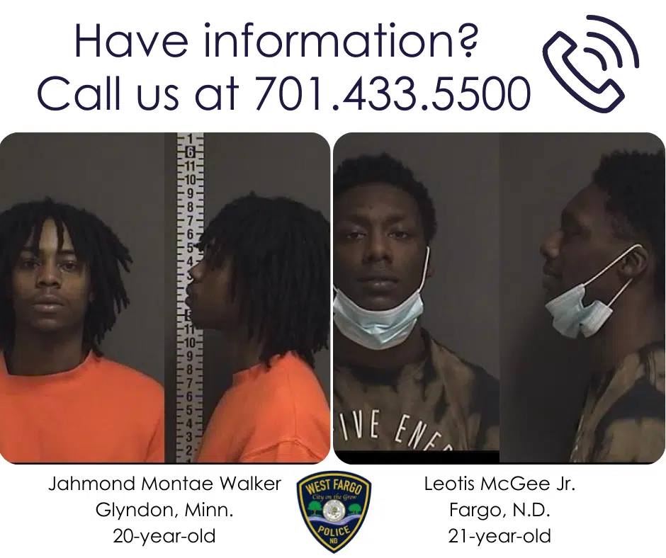 20-year-old male Jahmond Walker from Glyndon, Minnesota, and 21-year-old Leotis McGee from Fargo, North Dakota. Walker is wanted on a charge of conspiracy to commit aggravated assault and McGee is charged with aggravated assault and reckless endangerment.