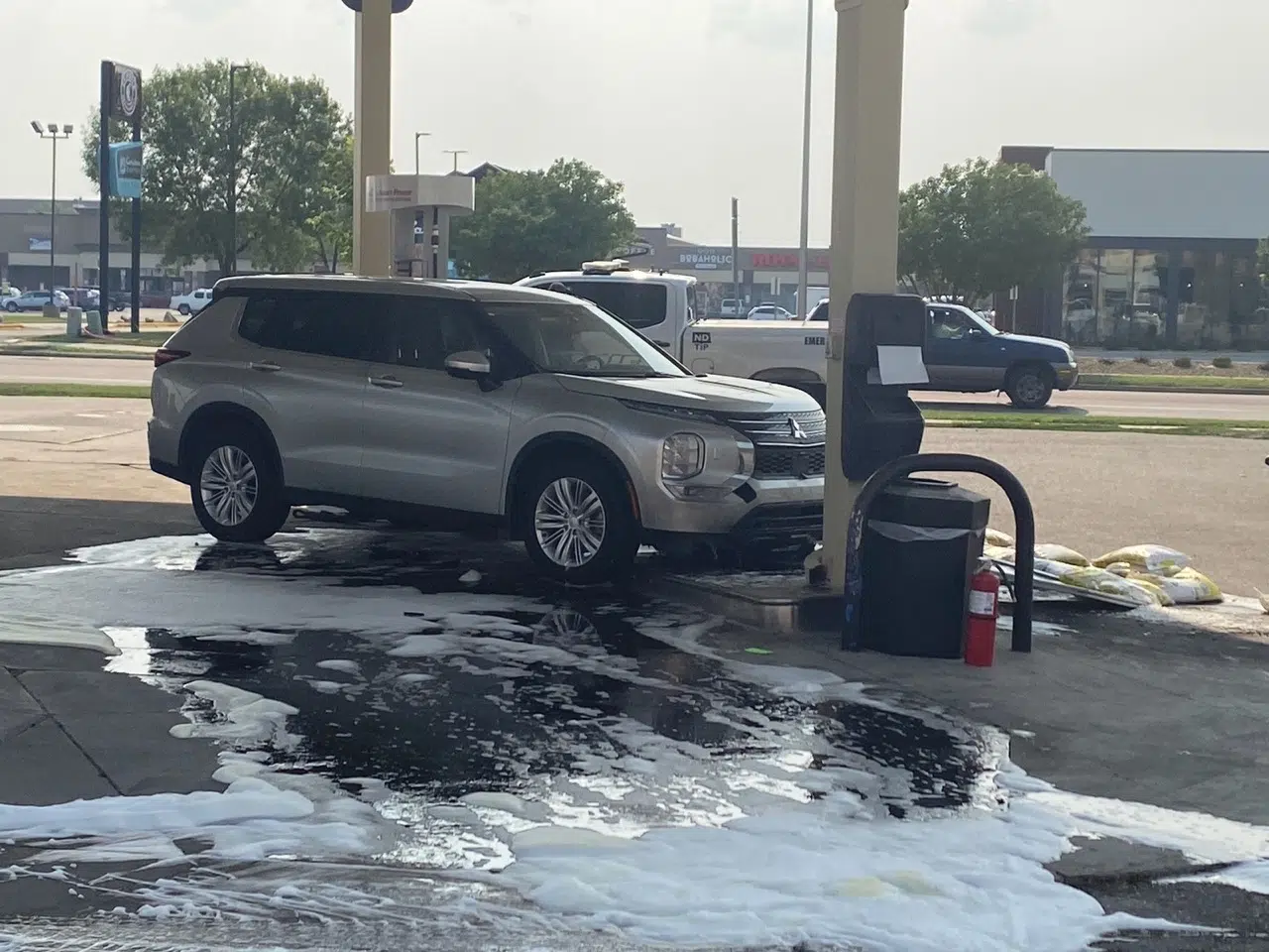 The collision caused the gas pump off of its mooring. A fire started but was contained. As of right now, there are no injuries reported.