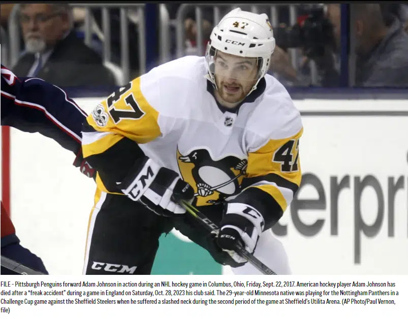 “The Pittsburgh Penguins join the entire hockey world in mourning the life of Adam Johnson, whose life tragically ended far too soon,” the Penguins said Sunday in a statement. “We offer our deepest condolences to Adam’s family and friends, as well as all of Adam’s past and present teammates and coaches. Adam will always be part of the Penguins family.”