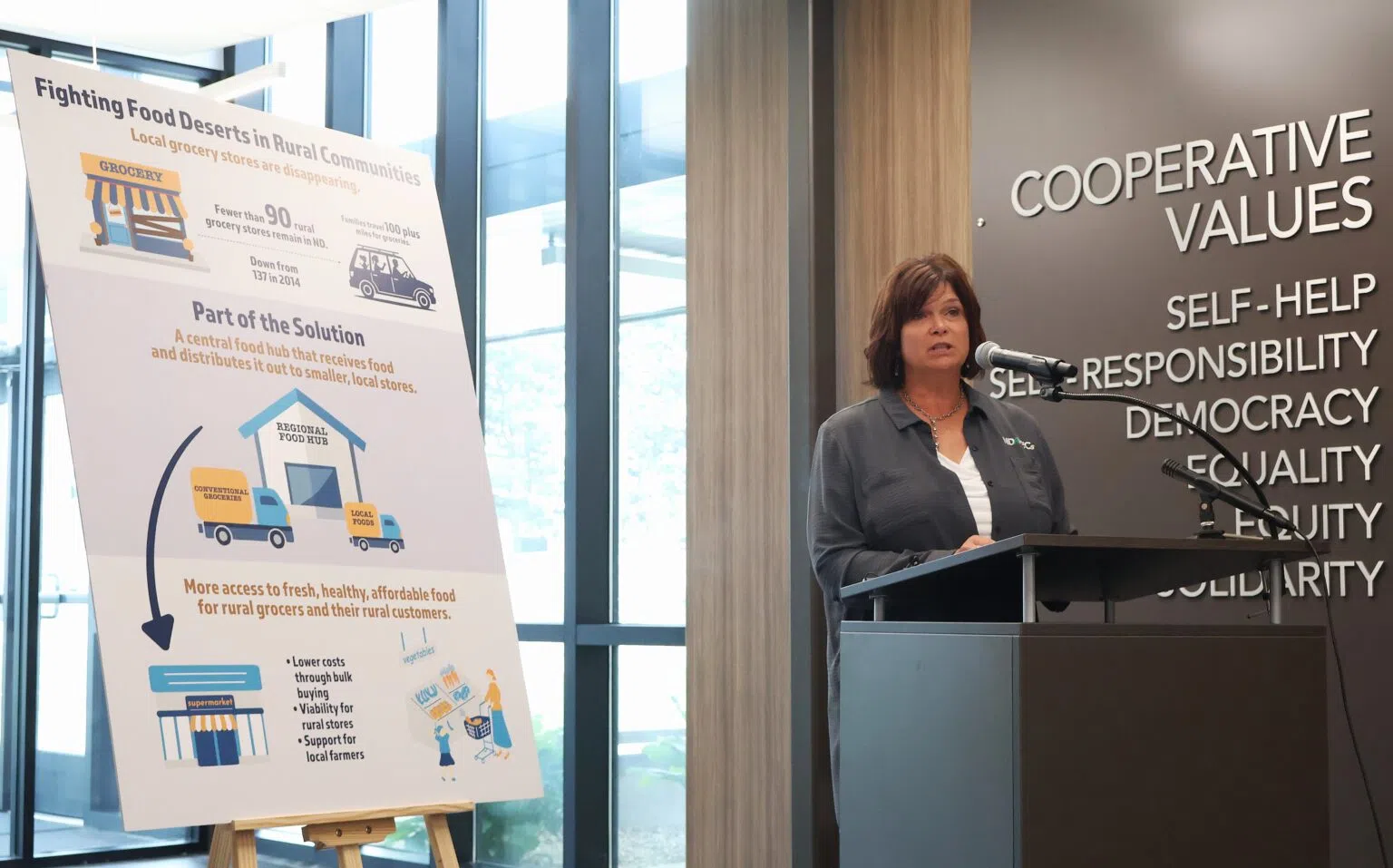 Ellen Huber, rural development director for the North Dakota Association of Rural Electric Cooperatives, speaks during a grant announcement on Aug. 4, 2025, in Mandan. The association is working to help sustain rural grocery stores. (Michael Achterling/North Dakota Monitor)