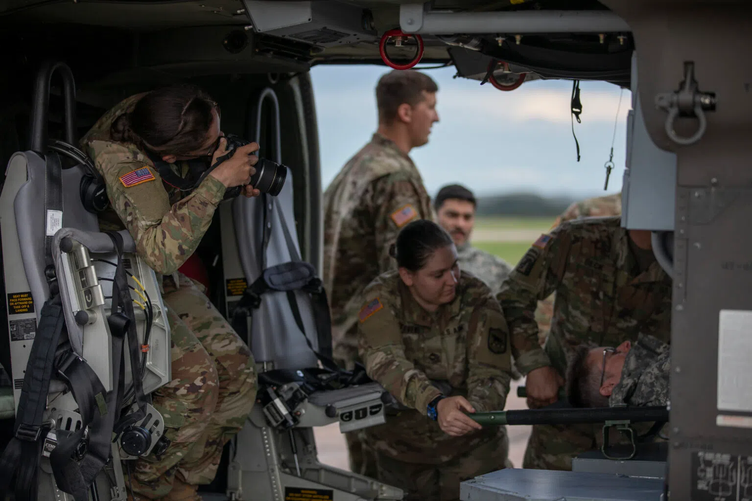 U.S. Army Spc. Breanne Donnell, 129th Mobile Public Affairs Detachment, South Dakota Army National Guard, documents her unit simulating a medical evacuation during the 2019 Golden Coyote Exercise at Custer State Park, S.D., June 16, 2019. The Golden Coyote Training Exercise is a three-phase, scenario-driven exercise conducted in South Dakota and Wyoming, which enables commanders to focus on mission essential task requirements, warrior tasks and battle drills. (U.S. Army Reserve photo by Spc. Lucas Wenger)
