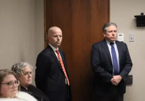 Justices Jerod Tufte and Daniel Crothers watch as court staff count ballots cast in the election for the North Dakota Supreme Court’s next chief justice on Dec. 10, 2025. (Photo by Mary Steurer/North Dakota Monitor)